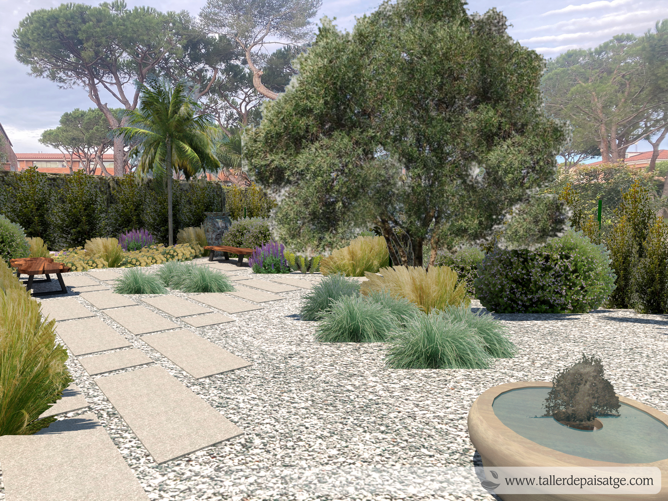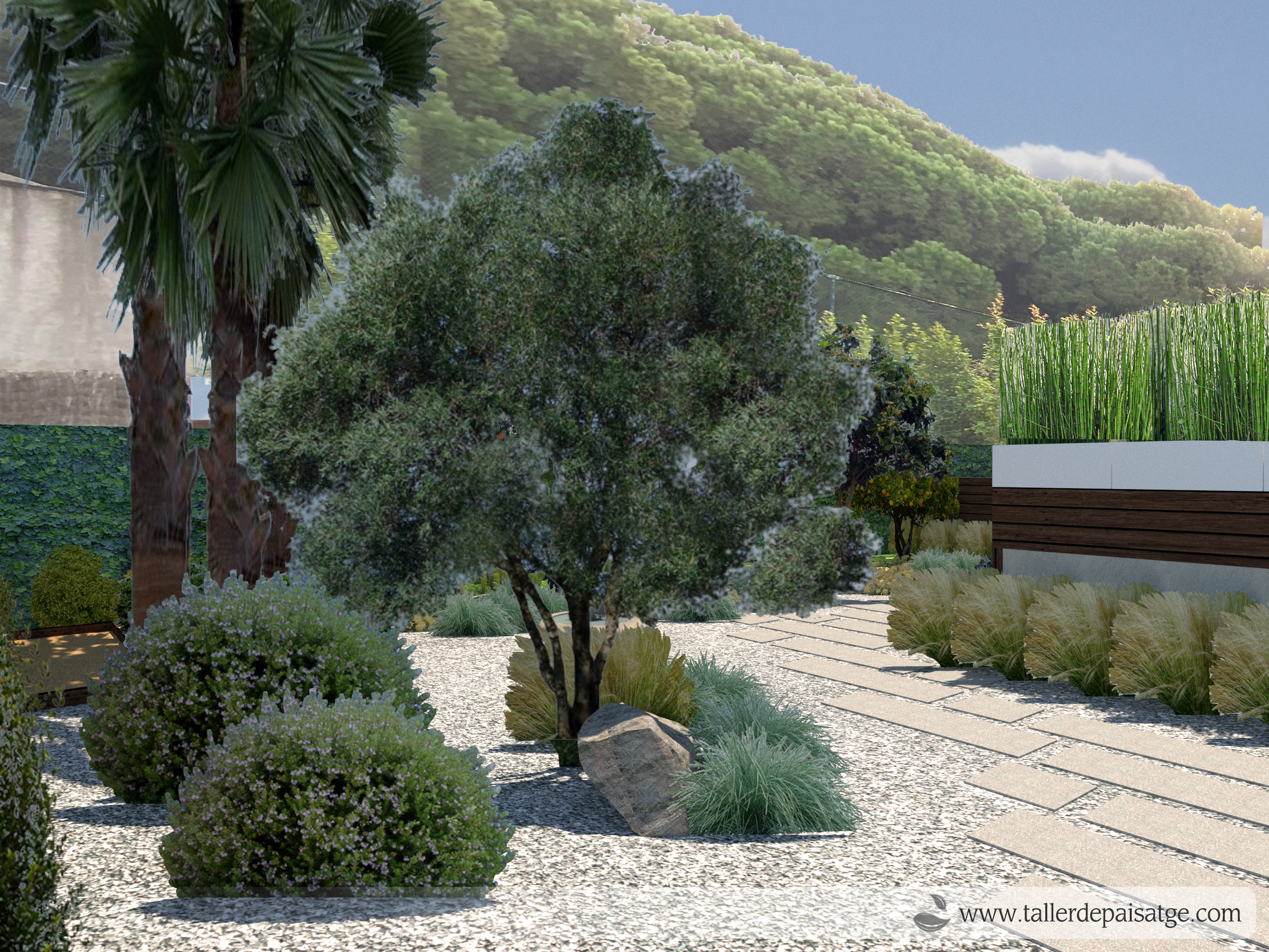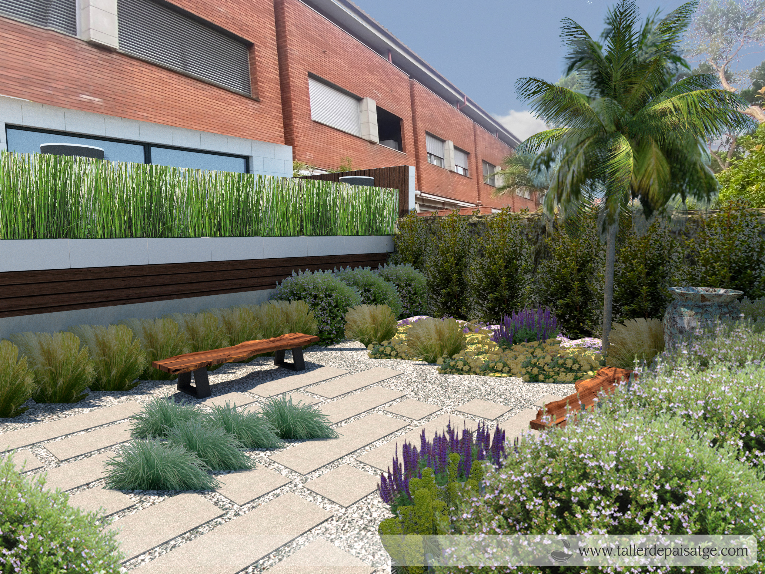 Actualización de un jardín esquinero formado inicialmente de césped buscando el ahorro de agua y mantenimiento