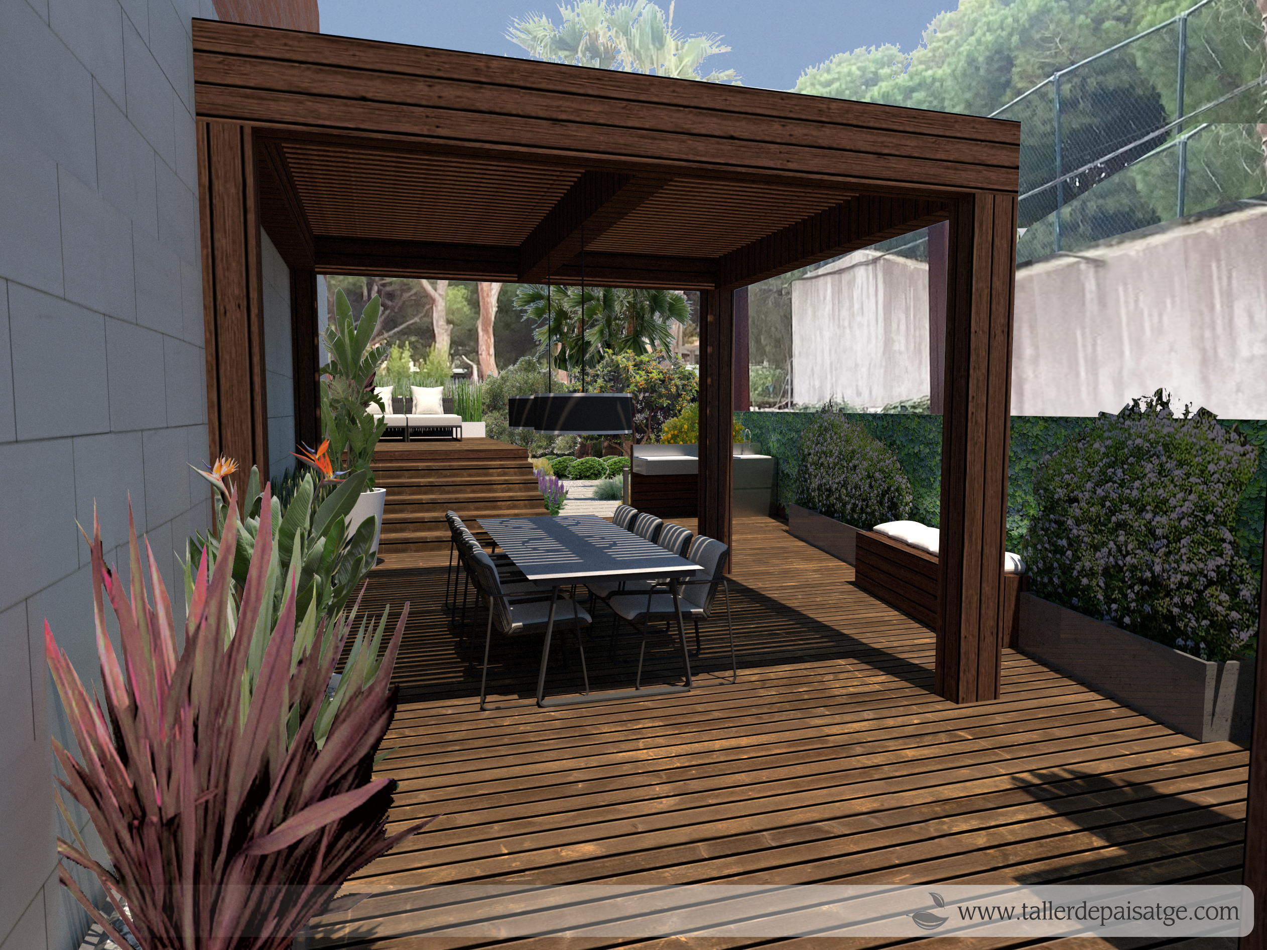 -Camino de losas de piedra gris sobre gravas generando nuevas zonas de estar con dos bancos de madera tropical.
